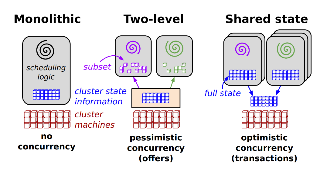 按照调度时机可以分为首次调度和运行时调度(也叫重调度),我们见到的大部分调度器都是首次调度。 针对调度器的架构,可分为单体(Monolithic)调度器、两层调度器、状态共享调度器这三类。
